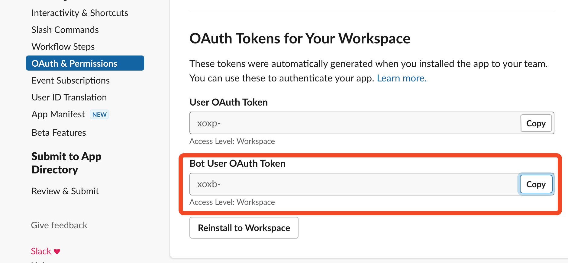 In Features/OAuth and Permissions/OAuth Tokens for Your Workspace: