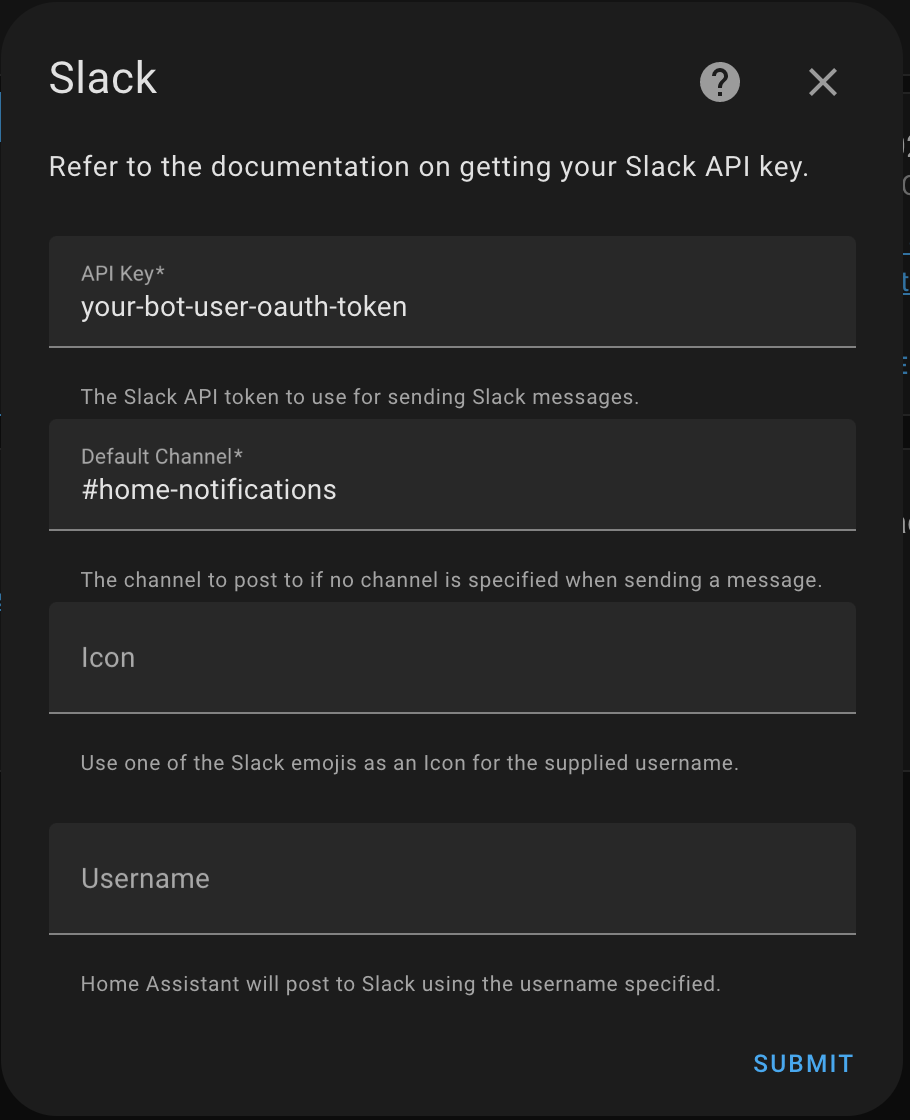 To add the Slack service to your Home Assistant instance, use this My button: