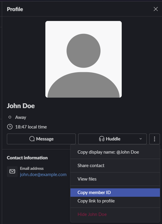 Some of the examples below use a member ID. This is a unique string assigned by Slack to all users (members and guests) and not a username set by the user. To get a member ID:
