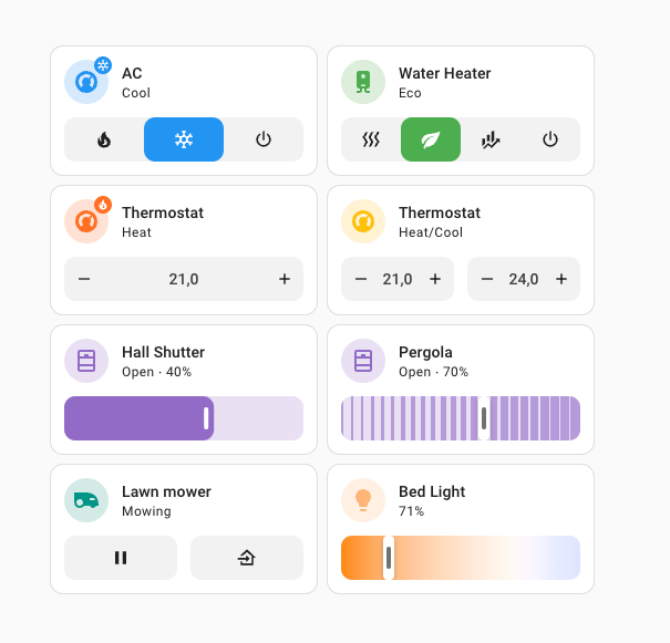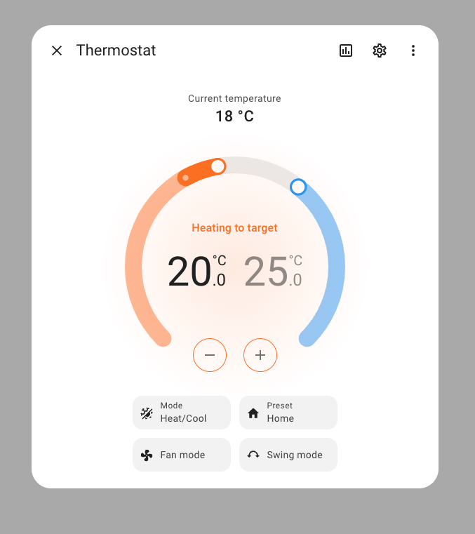 The entity dialogs for climate, humidifier, and water heater entities got an update, and if you ask me, it looks absolutely stunning! It now has a newly designed circular slider showing the current and target temperatures and allows you to easily swipe to the desired target temperature. There are also dedicated buttons to change the target, so it is easy to use if you are not using a touchscreen. It will glow in the middle to show its current action, for example when it is heating or cooling.