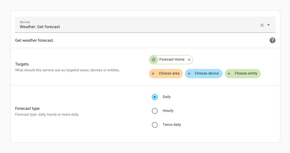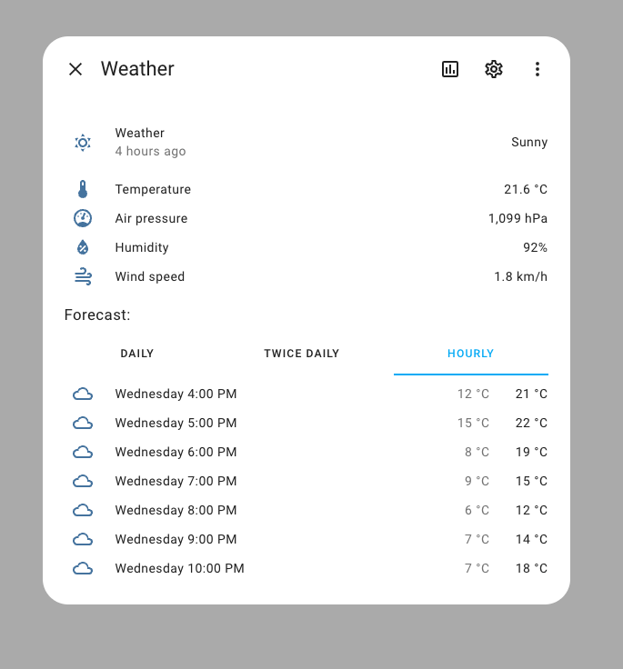 If an entity supports multiple forecasts, you can choose which forecast you want to see in the more info dialog. In the weather card in your dashboard, you can also now pick what kind of weather forecast you want to show in that card.