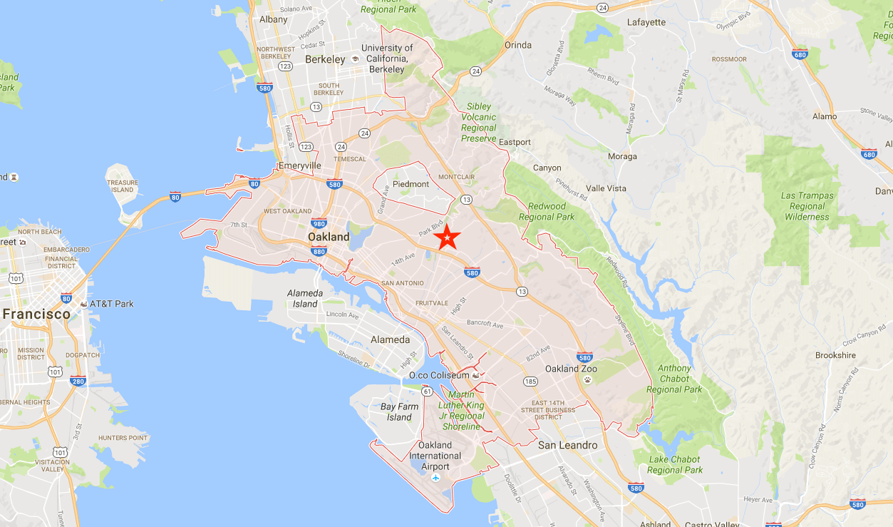 Geo-lookup on my IP resolves to Oakland with latitude/longitude pointing at the geographical center of the city.