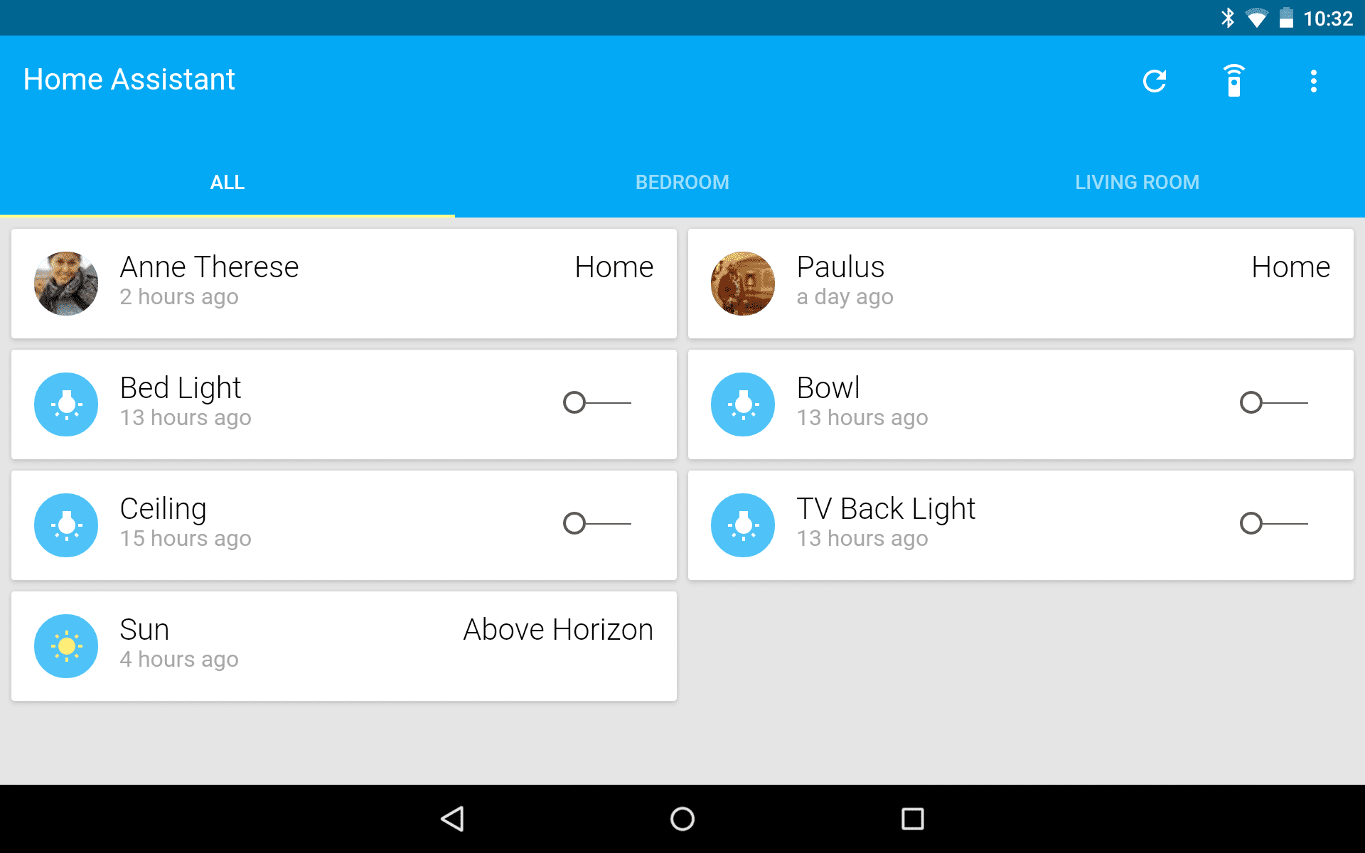 Example of a hub's dashboard. Showing the state of 2 persons, 4 lights and the sun.