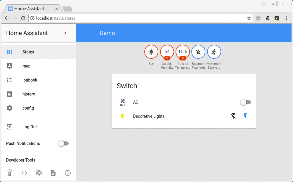 If you already have a configuration.yaml file in place then you will get a combination of your setup with all available demo platforms. This can be overwhelming for the audience. The suggestion is that you tailor the demo to your needs by only showing a few selected platforms. For example: