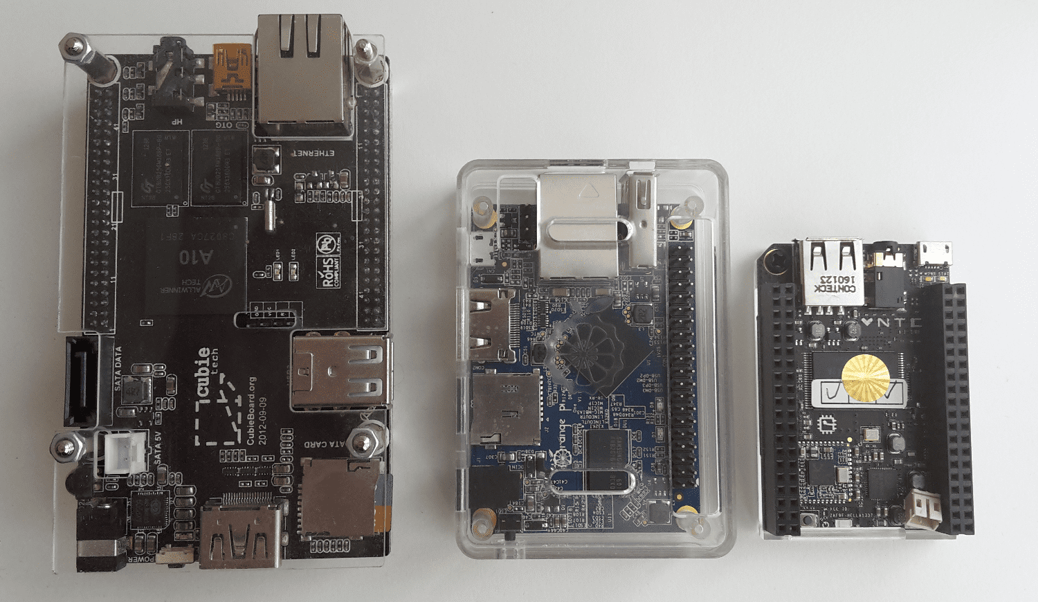 Size comparison of a Cubieboard, OrangePi One, and CHIP.