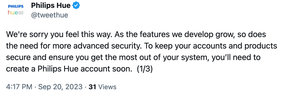 Dear Signify, please reconsider your decision and do not move forward with it. You’ve reversed bad decisions before. People care about privacy and forcing accounts will hurt the brand in the long term. The pain caused by this is not worth the gain.