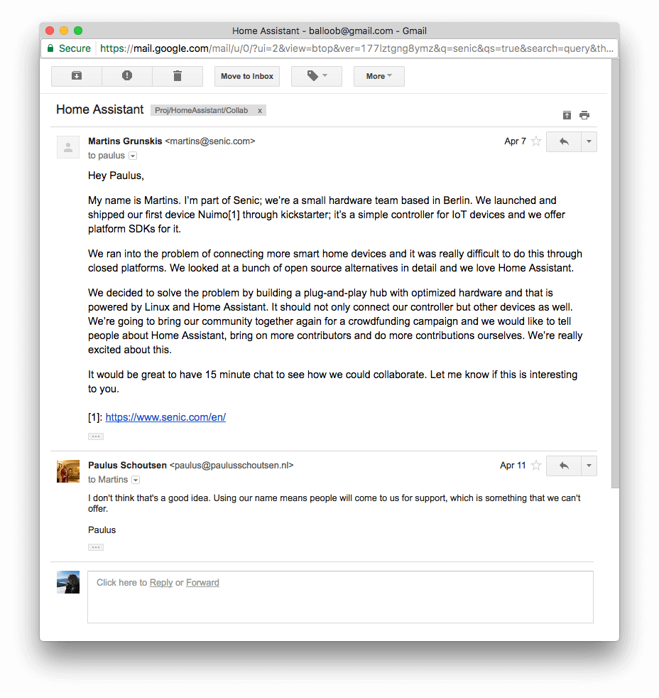 Senic, we know that this is probably not what you wanted to wake up to on the first day of your Kickstarter but you left us no choice. Please reach out to us to help make this right. We will always do everything in our power to protect the best interests of the Home Assistant community, our 500+ contributors and 250,000+ users. If we don’t hear from you by Wednesday, June 21st, we will be forced to consider further actions.