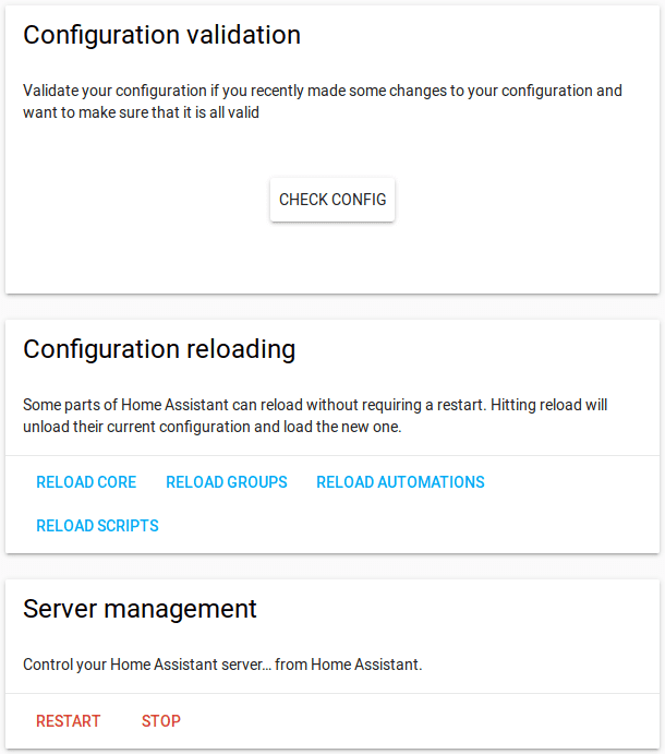 This section enables you to control Home Assistant from within Home Assistant. Check your configuration, reload the core, groups, scripts, automations, and the Home Assistant process itself with a single mouse click.
