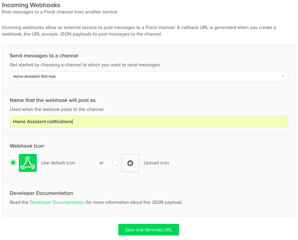 Go to the Flock.com Admin website and create a new “Incoming Webhooks”. Choose a channel to send the notifications from Home Assistant to, specify a name and press Save and Generate URL.
