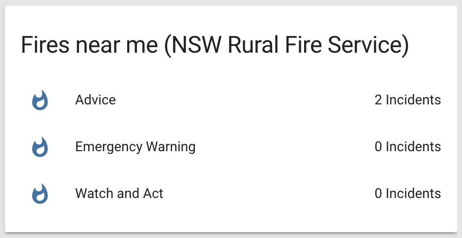 To enable the GeoRSS events sensor, add the following lines to your configuration.yamlThe configuration.yaml file is the main configuration file for Home Assistant. It lists the integrations to be loaded and their specific configurations. In some cases, the configuration needs to be edited manually directly in the configuration.yaml file. Most integrations can be configured in the UI. [Learn more] file. This is an example configuration showing bush fire incidents from the NSW Rural Fire Service. After changing the configuration.yamlThe configuration.yaml file is the main configuration file for Home Assistant. It lists the integrations to be loaded and their specific configurations. In some cases, the configuration needs to be edited manually directly in the configuration.yaml file. Most integrations can be configured in the UI. [Learn more] file, restart Home Assistant to apply the changes. The integration is now shown on the integrations page under Settings > Devices & services. Its entities are listed on the integration card itself and on the Entities tab.