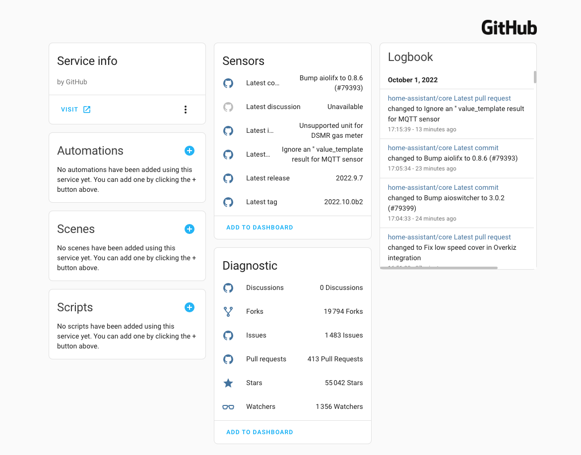 When you configure a repository to be tracked in this integration it will be represented as a service in the device panel and all entities related to the repository will be nested under that device. The device also provides a link to the repository on GitHub and an option to download diagnostics for the service.