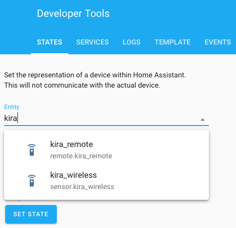Restart Home Assistant and you should now have an entity called kira_remote (or whatever you called it). To check go to Developer Tools > States and start to type “kira” within the entity list.