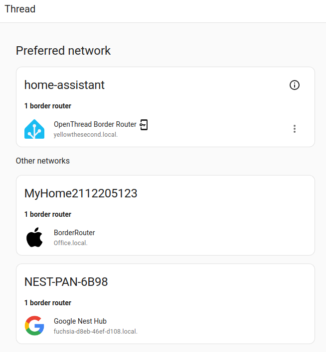 Today, each vendor forms their own Thread network when you start using their products. This means you can end up having a Home Assistant, an Apple, and a Google Thread network in your home. The Thread configuration panel lists all Thread border routers and groups them by the Thread network.