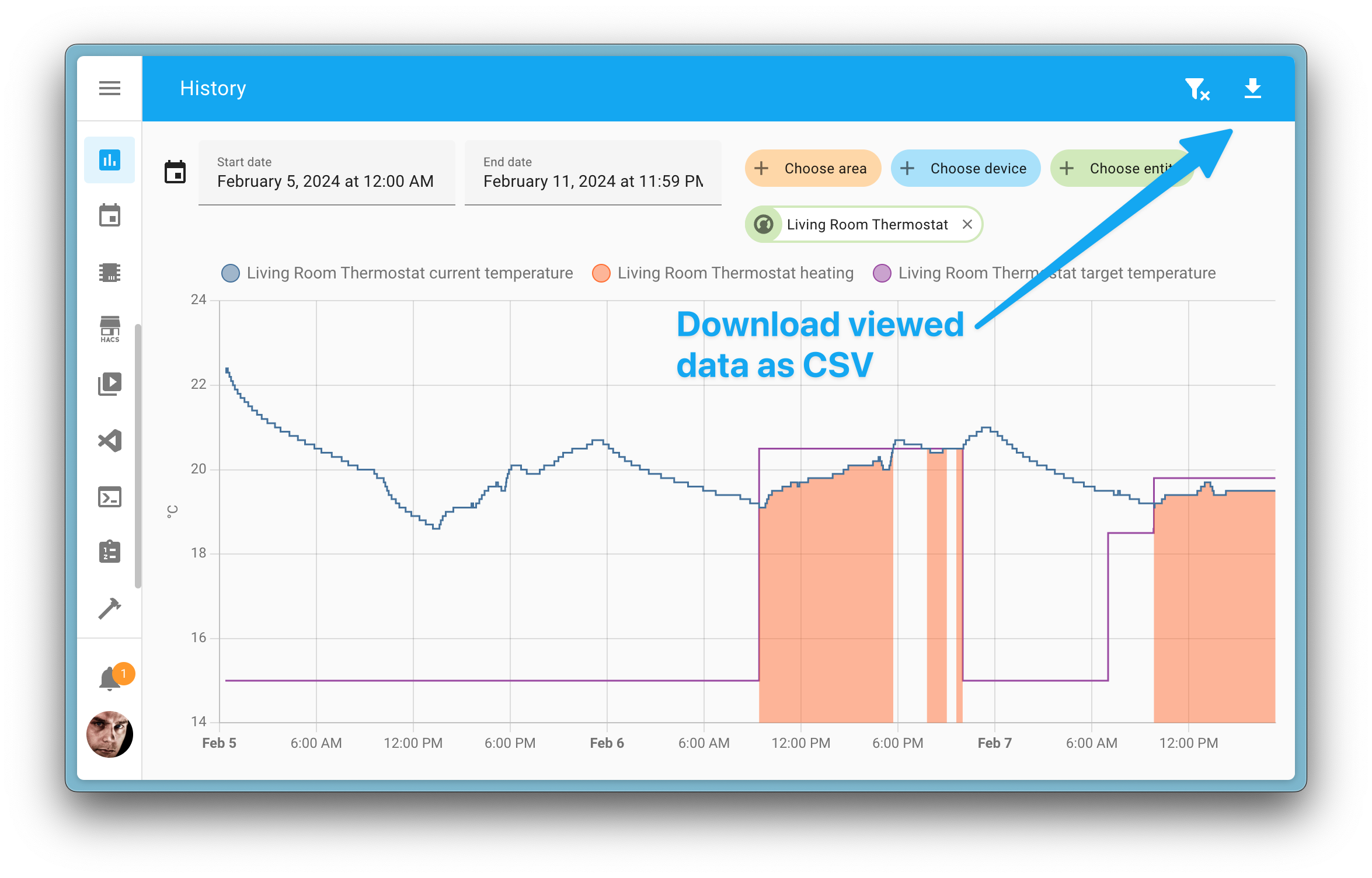 The following feature might be small, but it is a big deal for many. Home Assistant stores your data privately and locally; it is your data. To make this data more accessible, we’ve added a new feature to the history dashboard.
