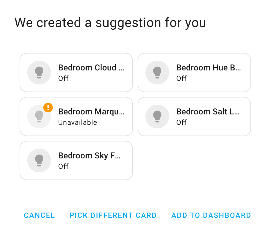 You will be prompted to choose which dashboard view you want to add them to. If you choose a view using the Sections view layout, the sensors or controls will be added as tile cards placed inside a new section.